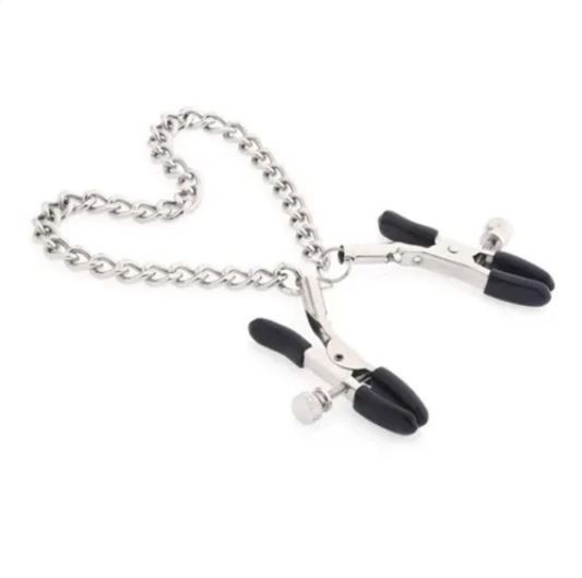 Grampos para os seios em metal com presilhas ajustáveis para diversificar a pressão, possui corrente que interliga os dois grampos.